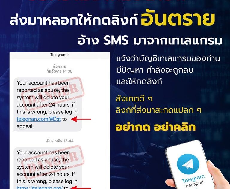 มิจฉาชีพส่งข้อความ SMS เข้ามารัว ๆ เป็นภาษาอังกฤษ อ้างว่ามาจาก Telegram ( เทเลแกรม ) แจ้งว่าบัญชีเทเลแกรมของท่านกำลังมีปัญหา และจะถูกลบทิ้งให้เข้าไปตรวจสอบตามลิงก์ที่ให้มา